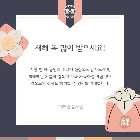 - 지난 해 여러분이 보여준 노력과 헌신에 진심으로 감사드립니다. 그 마음이 2025년에는 더 큰 기쁨으로 돌아오길 바랍니다. 새해 복 많이 받으세요.